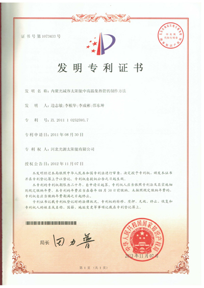 發(fā)明專利證書(shū)--內(nèi)聚光減容太陽(yáng)能中高溫集熱管的制作方法