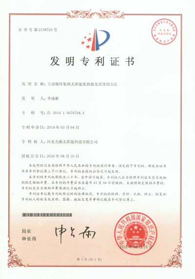 發(fā)明專利證書(shū)--主動(dòng)循環(huán)集熱太陽(yáng)能集熱器及其使用方法