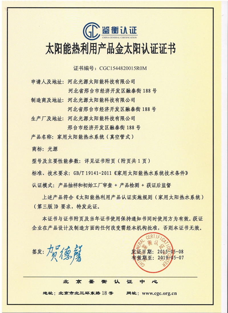 太陽(yáng)能熱利用產(chǎn)品金太陽(yáng)認(rèn)證證書(shū)