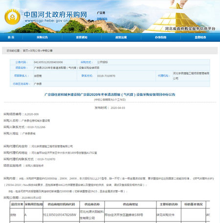 廣宗縣2020年冬季清潔取暖(氣代煤)設備采購安裝項目中標